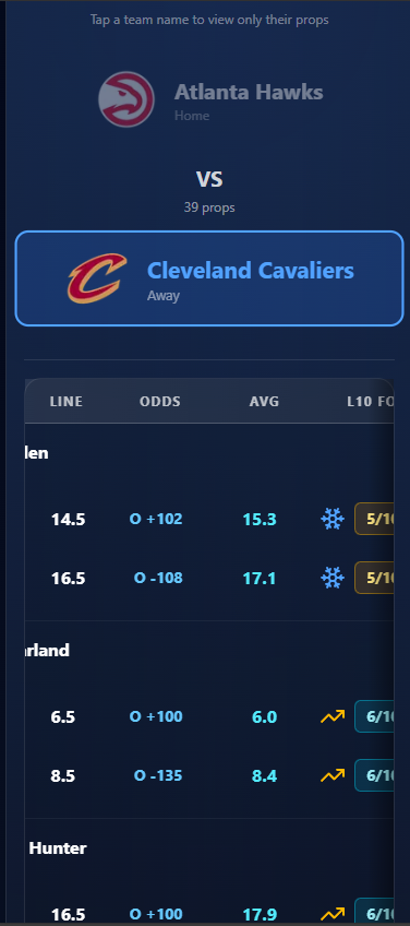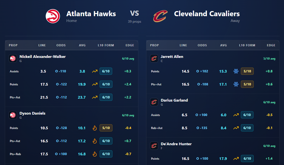 See the line, current odds, player averages, hit rates, and edge for every prop.